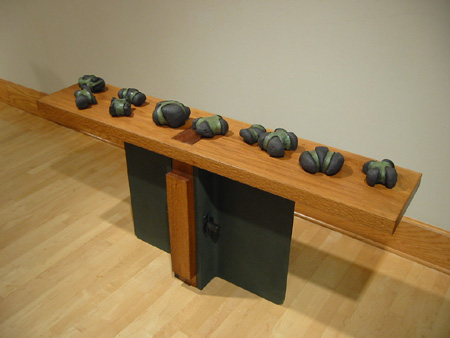In his work, Freeland offers metaphors to reorient the viewer to nature, environment, and the basic rituals of living. His sculpture can be seen as a re-evaluation of the 19th century processes of bending wood and working with stone and steel.